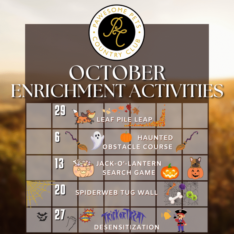 We’re helping pups stay calm and confident for Halloween night with a playful desensitization experience. Staff dress up, ring doorbells, knock, and call out “Trick or Treat!”—giving dogs a chance to practice staying relaxed when the real goblins and ghouls come knocking.